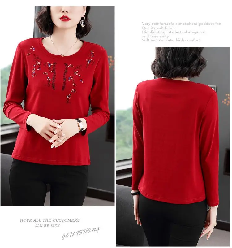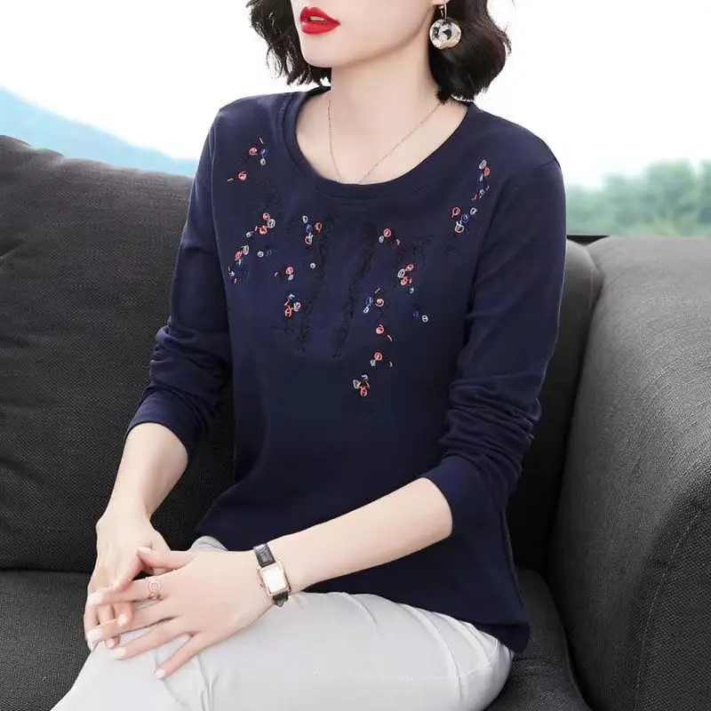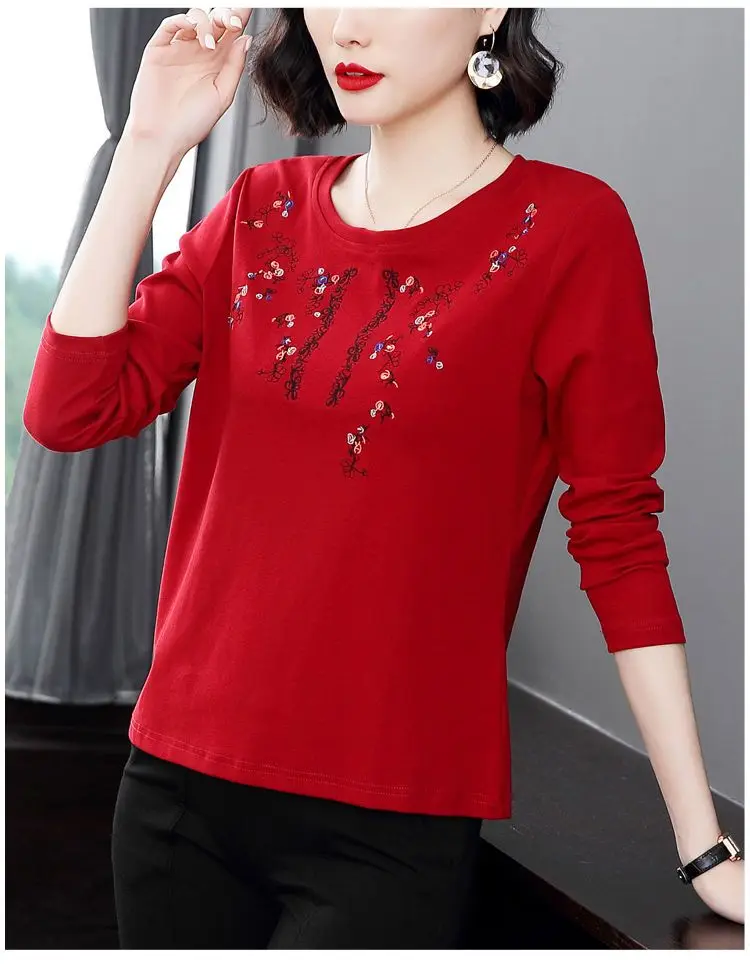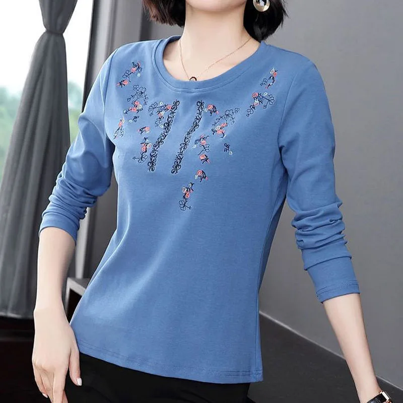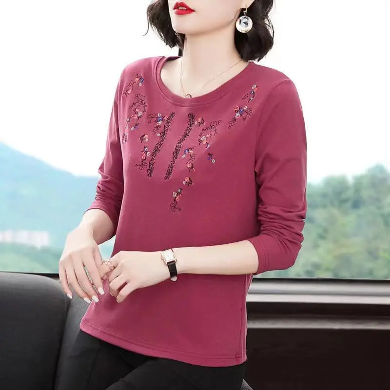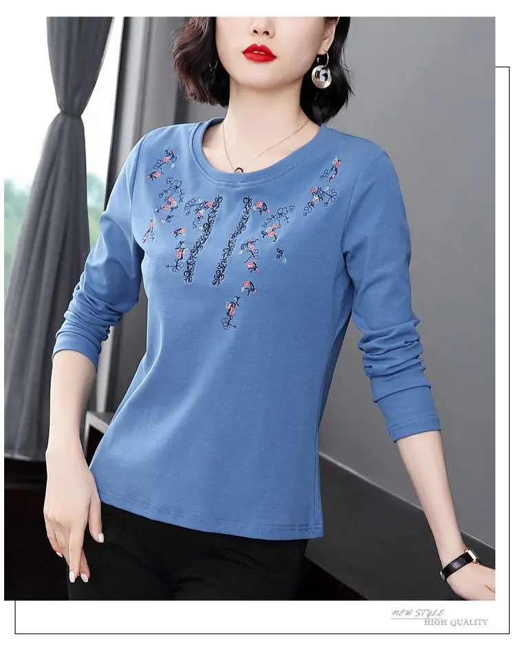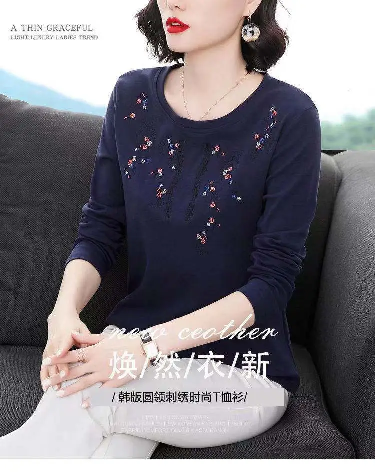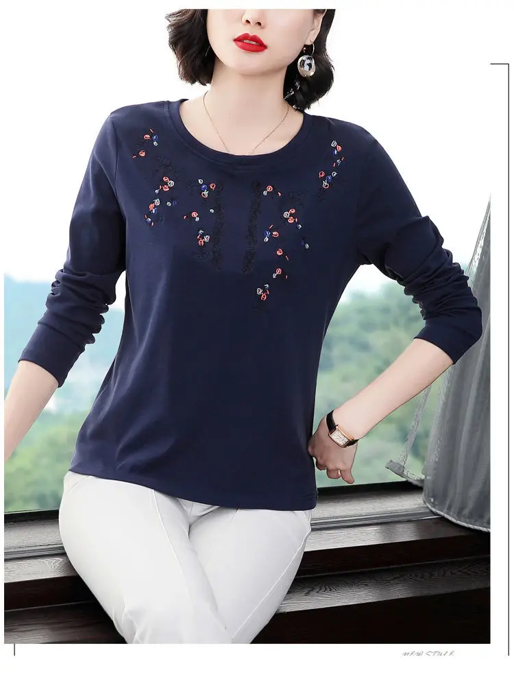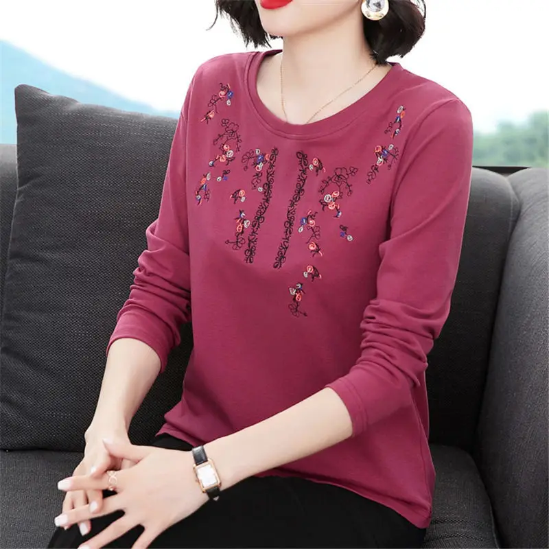 Pure Cotton Exquisite Embroidery Plus Size Comfortable Spring Summer Round Neck Long Sleeve Women’s Clothing Floral T-Shirts