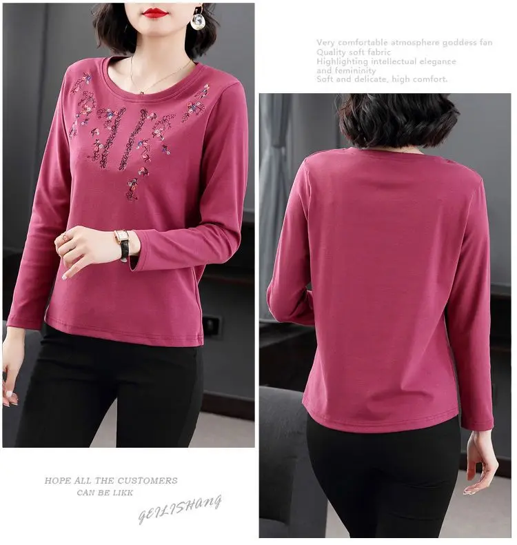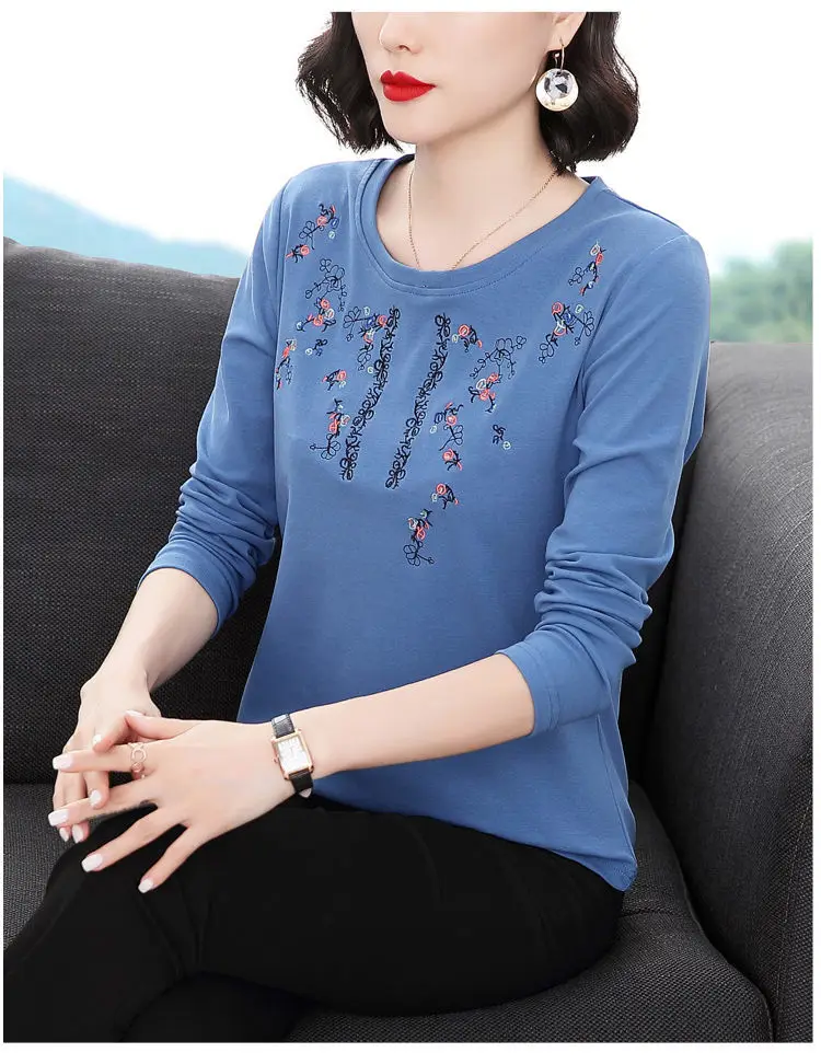 Home Uncategorized Pure Cotton Exquisite Embroidery Plus Size Comfortable Spring Summer Round Neck Long Sleeve Women’s Clothing Floral T-Shirts