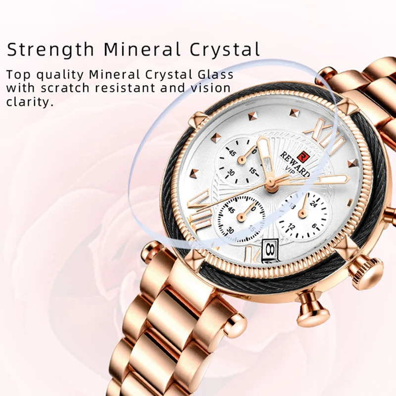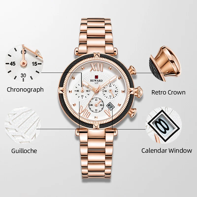 REWARD Fashion New Women Watches Elegant Chronograph Dial calendar Stainless metal Strap Quartz Japanese Movement Waterproof