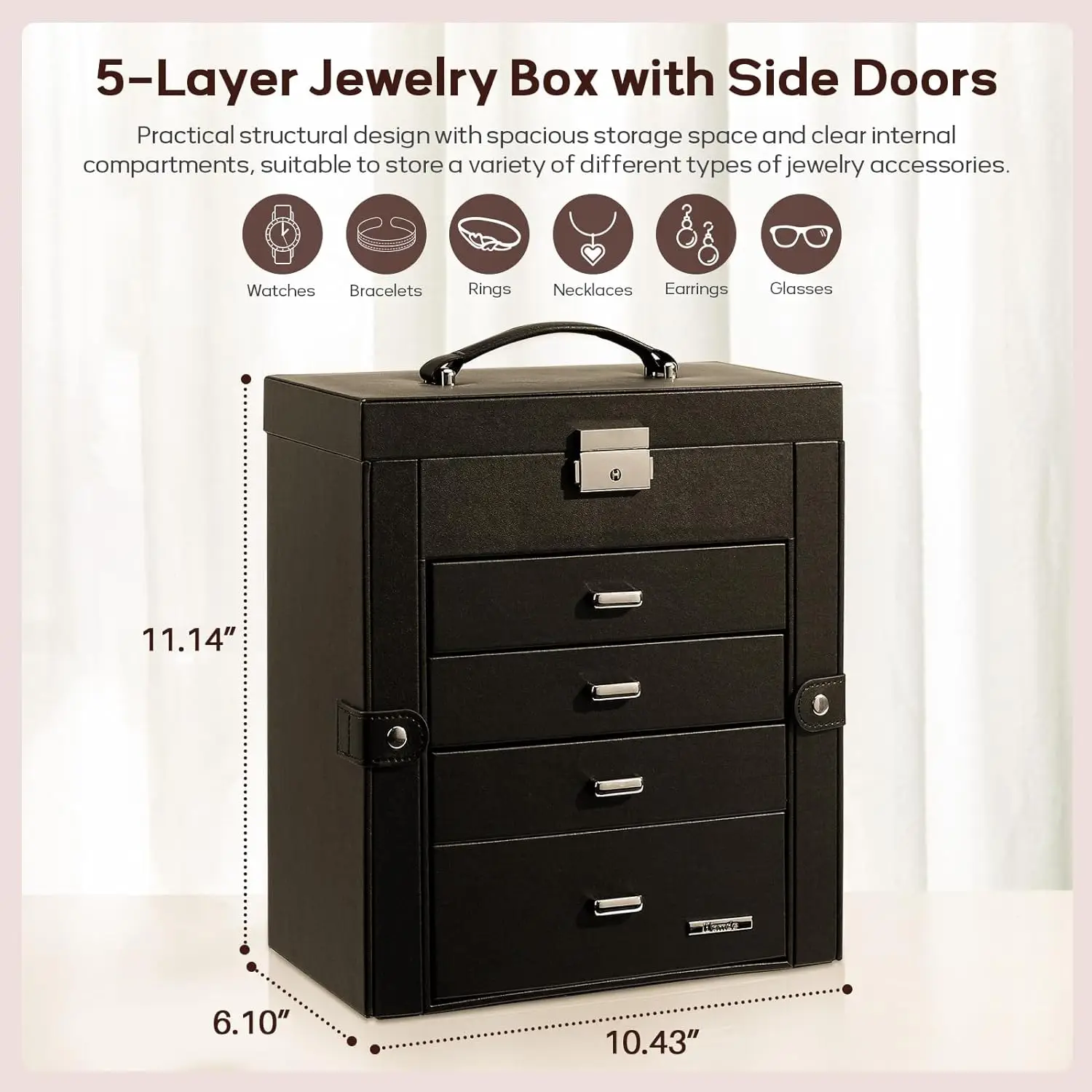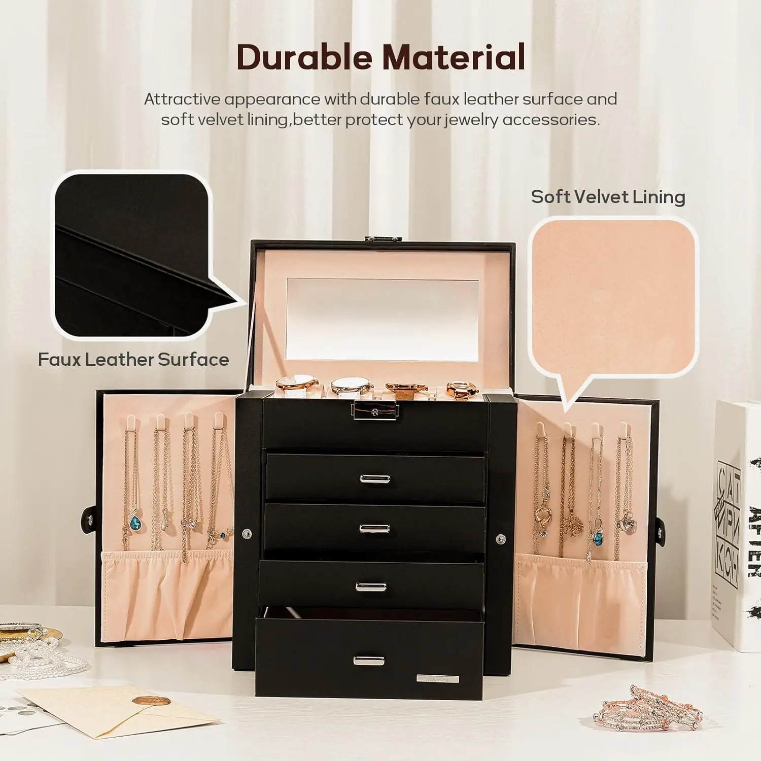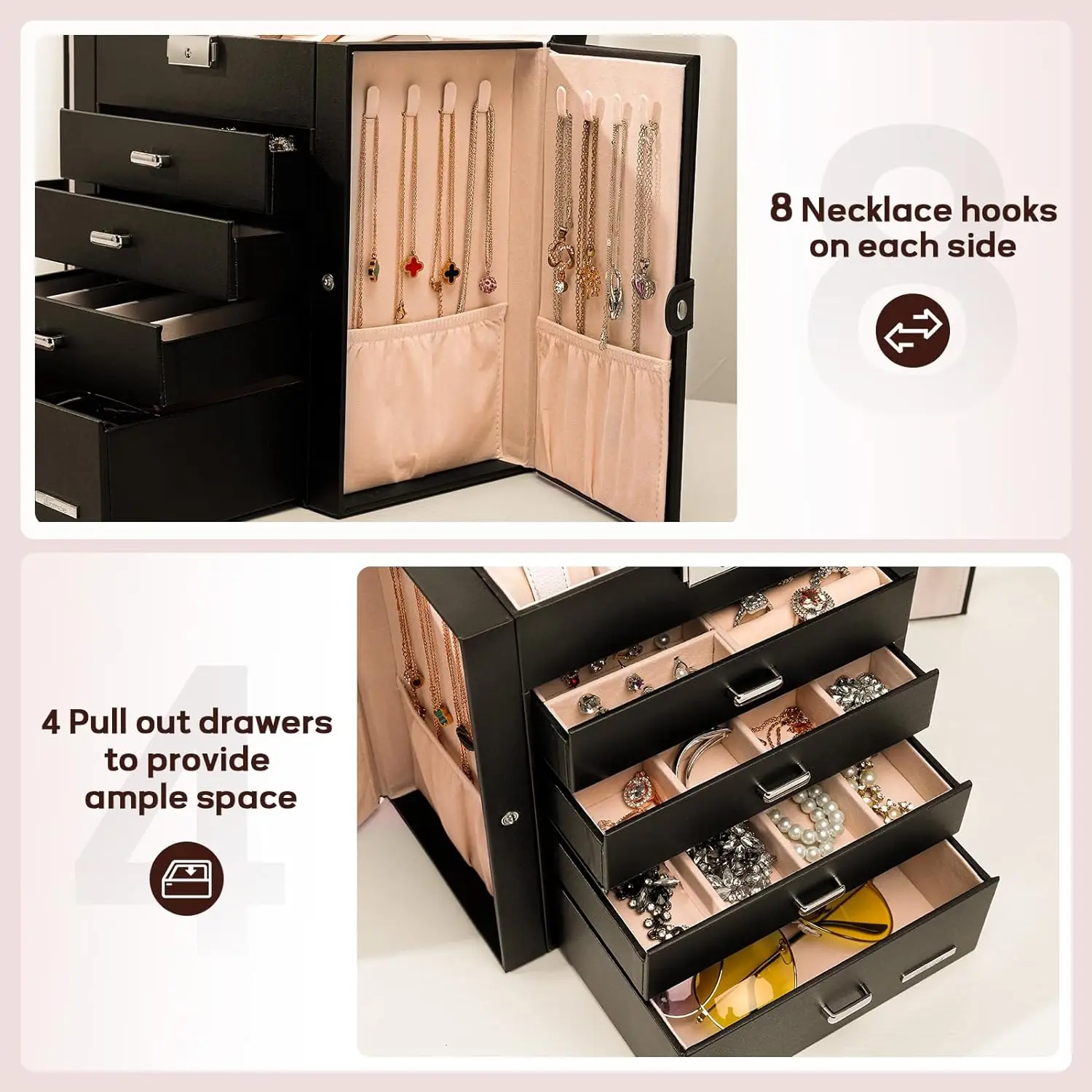 Synthetic Leather Huge Jewelry Box Mirrored Watch Organizer Necklace Ring Earring Storage Lockable Gift Case