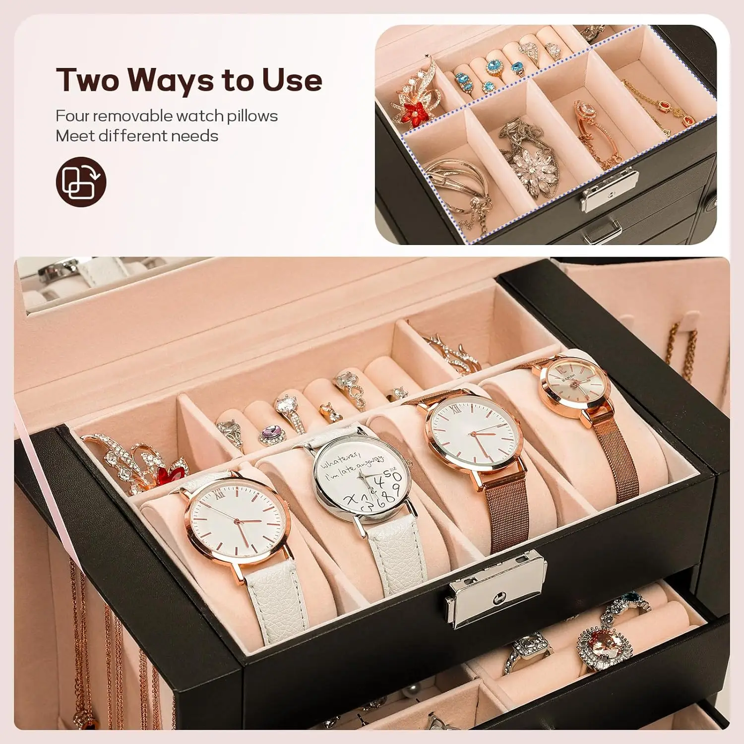 • Jewelry & Watch Box: With 4 detachable pillows within the prime layer, you can’t solely conveniently and safely retailer your jewellery but in addition your watches.