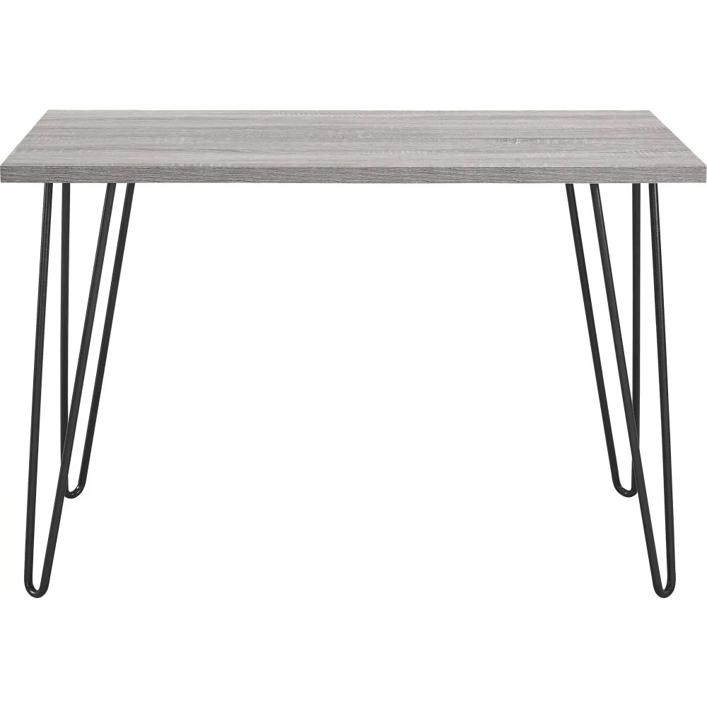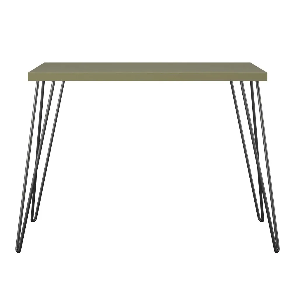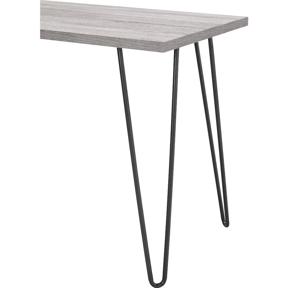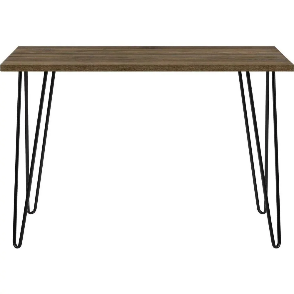 - Made from laminated particleboard and metallic hairpin legs, the white end matches the black legs for an industrial look