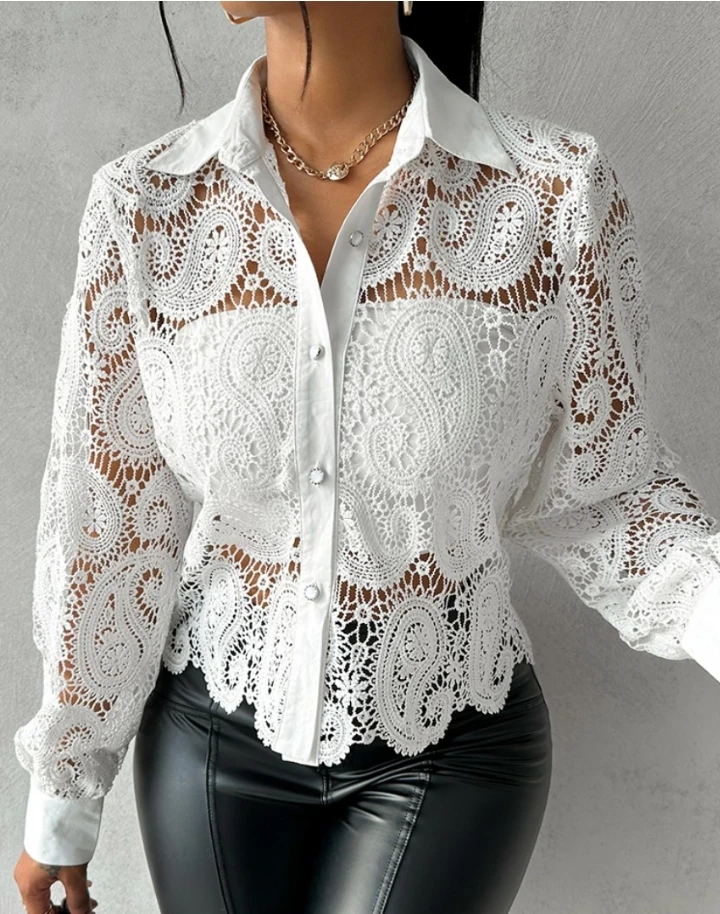 Home Uncategorized Female Clothing Sexy Lace Hollow Out Top 2024 Latest Casual Polo Neck Shirt Commuting Style Full Shoulder Long Sleeve Pullover