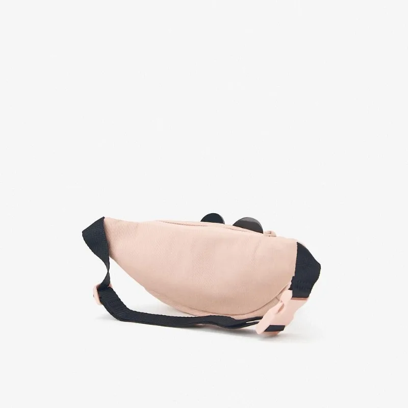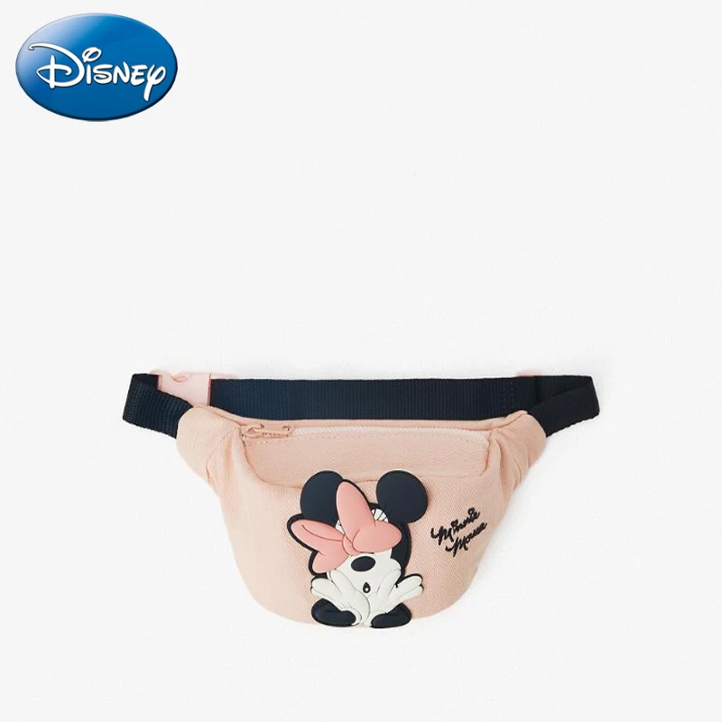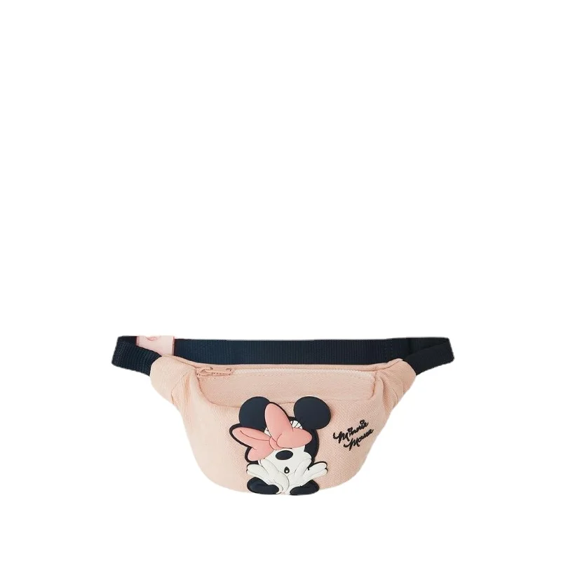Cotton belt bag with taped Minnie Mouse patch. Main compartment zips shut. Fabric lining. Adjustable waistband with snap closure.