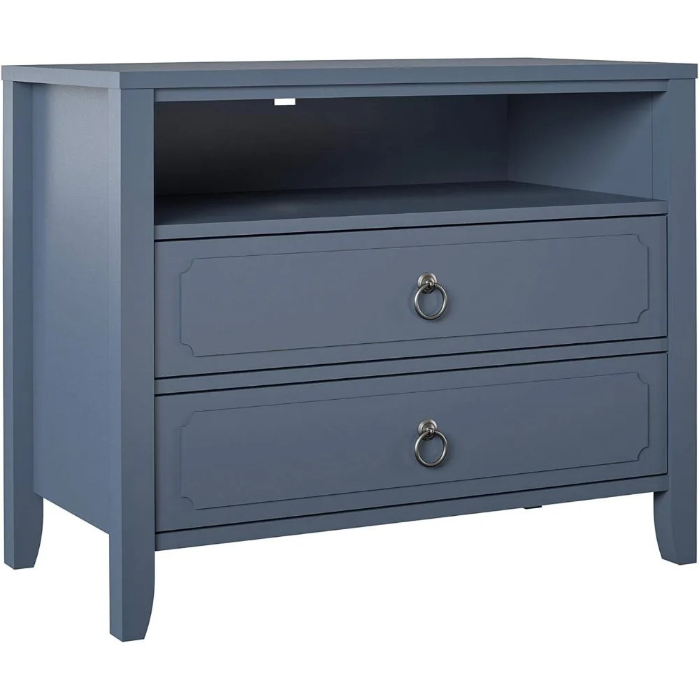 • Made of painted MDF with actual wooden legs, the blue end pairs with the ring drawer pulls and ornamental drawer entrance molding for a chic look