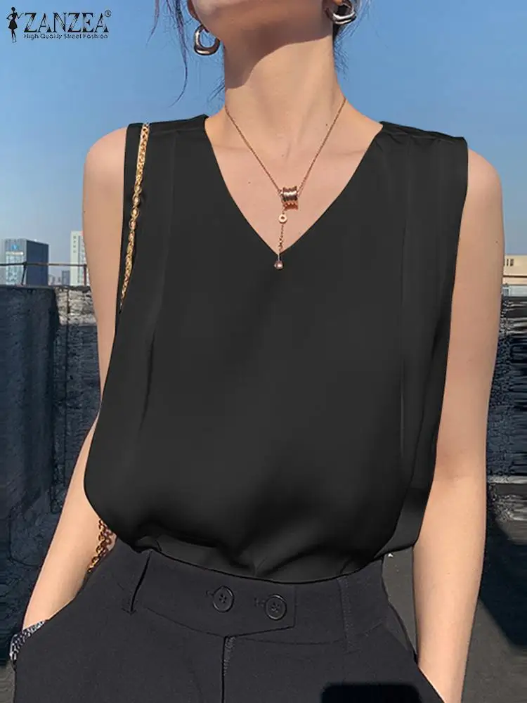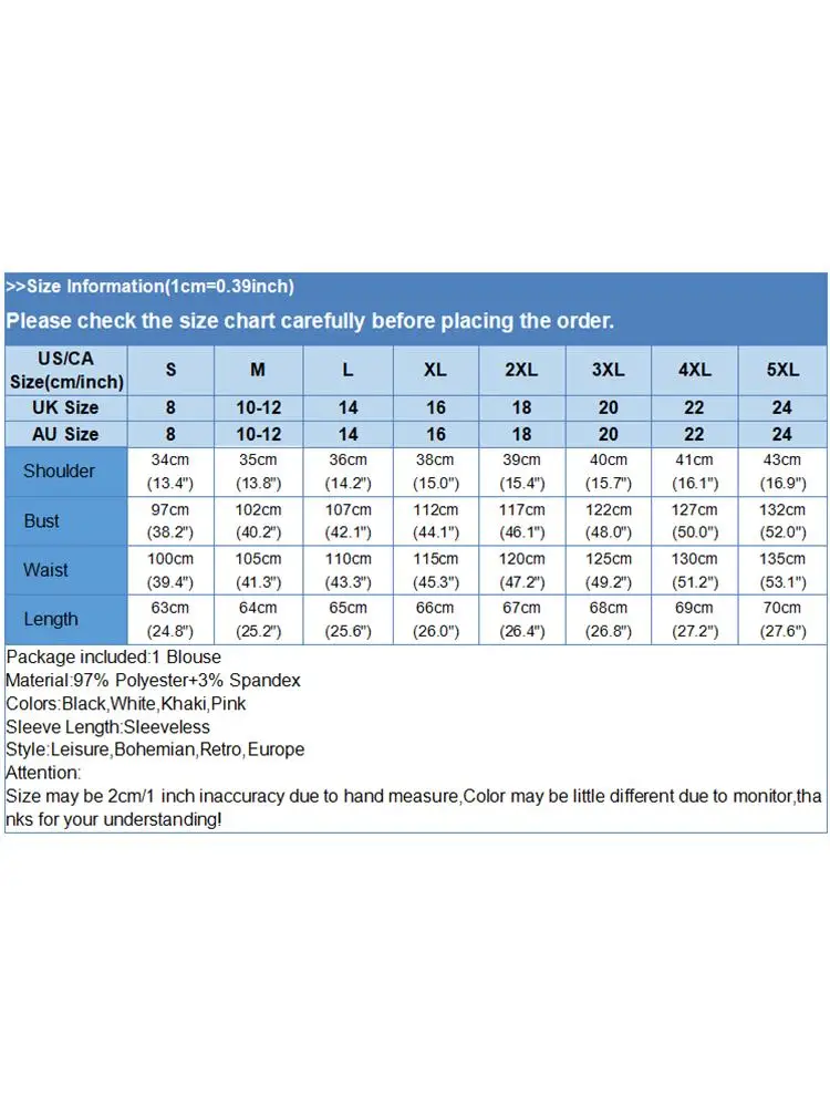 | Package included:1 Blouse Material:97% Polyester+3% Spandex Colors:Black,White,Khaki,Pink Sleeve Length:Sleeveless Neckline:V-Neck Pattern:Solid Color Thickness:Thin Style:Leisure,Bohemian,Retro,Europe Season:Spring,Summer,Autumn Occasion:Family,Party,Beach,Wedding,Holiday,Employment Label: Yes Attentions: 1.The Real Object May Exist Slightly Colors Differences Compared To Images As Different Computers Display.Caution If Minding,Thanks. 2.There Might Be A Manual Measuring 1-3 cm Error.Sorry For Any Inconvenience. 3.Please Prevail On Real Item, Model Images For Reference Only. 4.Attention!!!Please verify the dimensions chart fastidiously earlier than putting the order.