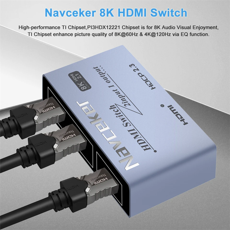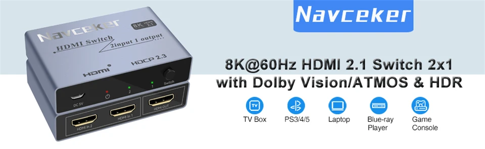 ZY-HS211,Navceker 8K@60Hz 4K@120Hz HDMI Switch can join two HDMI sources like blu-ray participant and PS3, PS4, PS4 professional, PS5 and many others,to a single HDMI show like HDTV. and you’ll switch the HD sources very conveniently by utilizing the easy-click switch button on the unit . The system is suitable with HDMI-compatible 2.1, 3D and 8K Ultra HD.